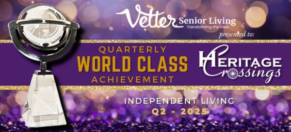 Vetter Senior Living presents a Quarterly World Class Trophy to the Independent Living community demonstrating outstanding performance in achieving the VSL World Class Standards. The award determination is based on the highest percentage of World Class expectations achieved (minimum of 60%) for their category.